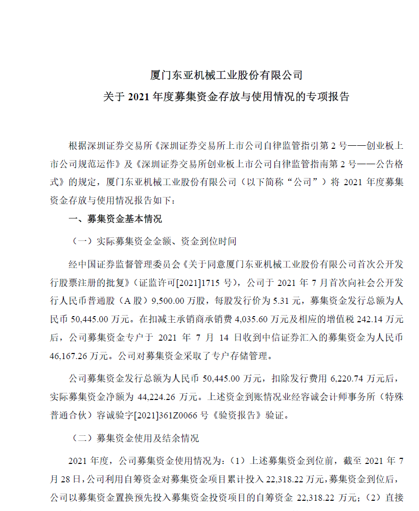 关于2021年度募集资金存放与使用情况的专项报告