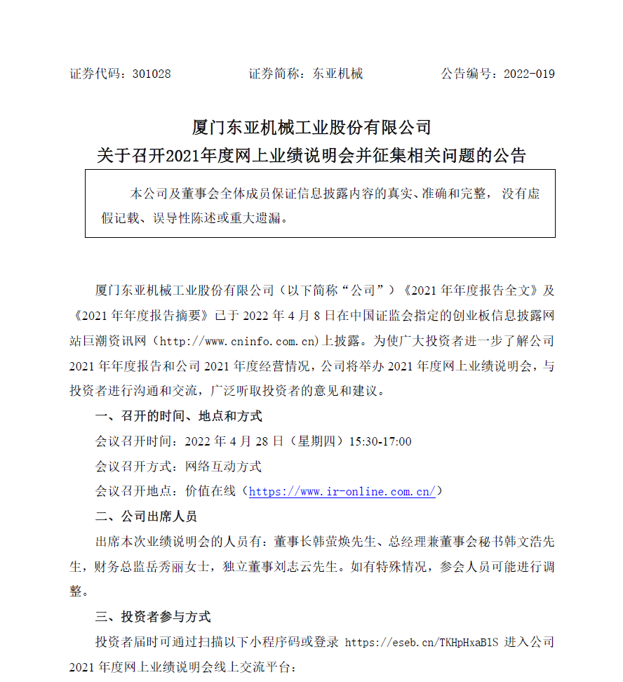 关于召开2021年度网上业绩说明会并征集相关问题的公告