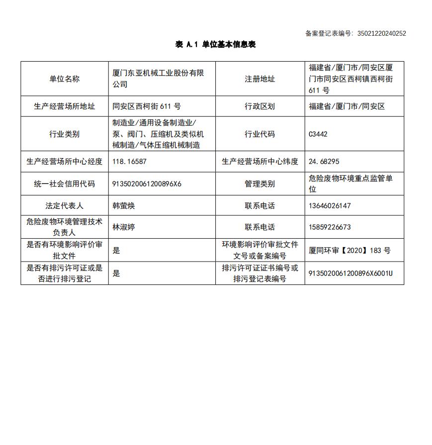厦门东亚机械工业股份有限公司 环境保护信息公开表