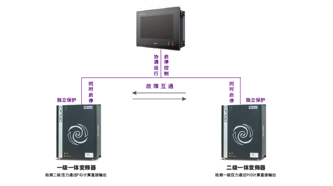 ZLS-2iC二级压缩空压机启动后,由显控一体机发出启动命令通过高速通讯协议,确保两级间的快速响应同时启动两台一体变频器,变频器启动后,由变频器内部控制系统独立控制各级的压力变送器直接接在一体变频器上,压力读取、PID响应速度更快,确保能够快速恒压。协调工作同启同停,任意一台空压机停机或出现故障时,另外一台立即跟随停机。即便是通讯线断了,一体空压机也能独立保护,根据传感器监测的数值,做出保护停机的动作。